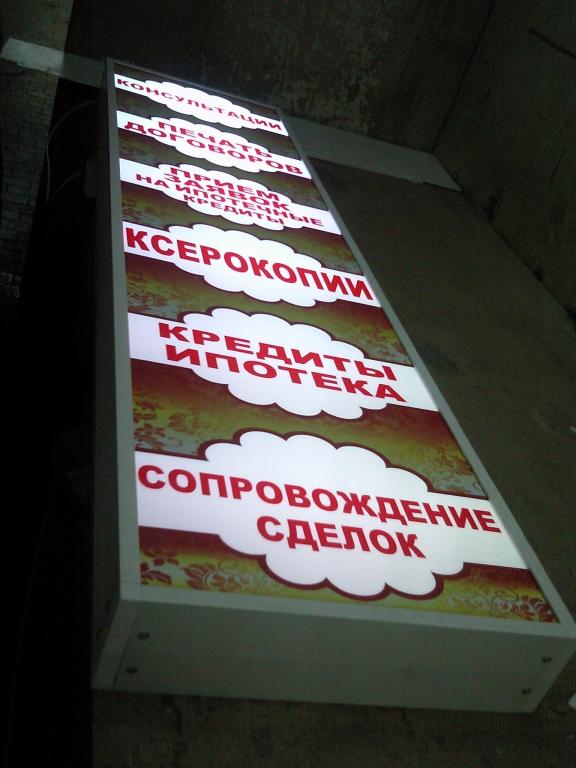 Световые коробаСветовой короб (лайнтбокс) - это светотехническое изделие, которое представляет собой объемную конструкцию с лицевой поверхностью из материала пропускающего свет), с боковинами и тыльной поверхностью из металла или пластика ПВХ. Внутри светового короба установлен источник света, который освещает лицевую поверхность. Световые короба широко применяются как в наружной рекламе, так и в интерьерной. Этот вид вывески прекрасно заметен как днем, так и ночью, благодаря внутренней подсветке. |